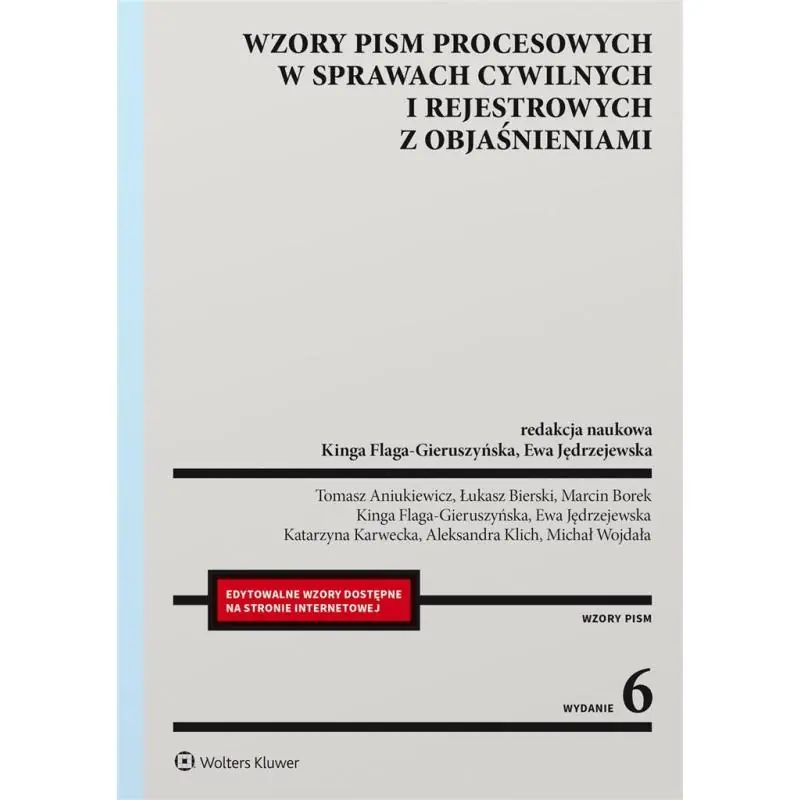Publikacja zawiera blisko 240 wzorów pism najczęściej stosowanych na poszczególnych etapach postępowania rozpoznawczego, a także w postępowaniu zabezpieczającym i egzekucyjnym. Każdy wzór został opatrzony szczegółowym komentarzem analizującym znaczenie i zakres stosowania poszczególnych instytucji wyrażonych w pismach procesowych, a także uwzględniającym praktyczne aspekty stosowania przepisów prawa materialnego oraz procesowego związanych z danym pismem procesowym. W opracowaniu ukazano zarówno formalne, jak i merytoryczne aspekty konstruowania pism procesowych na różnych etapach i w różnych rodzajach procesu cywilnego, postępowania nieprocesowego (w tym w sprawach rejestrowych), a także w postępowaniach pomocniczych. W szóstym wydaniu uwzględniono zmiany dotyczące m.in.: • sposobu sporządzania pism wnoszonych przez stronę zastępowaną przez adwokata, radcę prawnego, rzecznika patentowego lub Prokuratorię Generalną Rzeczypospolitej Polskiej, które powinny zawierać wyraźnie wyodrębnione oświadczenia, twierdzenia oraz wnioski, w tym wnioski dowodowe, • wprowadzenia instytucji reprezentanta dziecka dla dziecka pozostającego pod władzą rodzicielską, którego żadne z rodziców nie może reprezentować, • zasad dokonywania przez rodziców czynności polegającej na odrzuceniu spadku w imieniu dziecka w przypadku uprzedniego odrzucenia spadku przez rodzica (brak konieczności uzyskania zezwolenia sądu opiekuńczego). Książka zawiera zarówno uaktualnione, jak i całkowicie nowe wzory pism procesowych, wśród których warto wymienić m.in.: • wniosek o rejestrację fundacji rodzinnej w rejestrze fundacji rodzinnych - w związku z wprowadzeniem instytucji fundacji rodzinnej oraz rejestru fundacji rodzinnych, • wniosek o zobowiązanie osoby stosującej przemoc domową do opuszczenia wspólnie zajmowanego mieszkania i jego bezpośredniego otoczenia lub o wydanie zakazu zbliżania się do wspólnie zajmowanego mieszkania i jego bezpośredniego otoczenia, lub zakazu zbliżania się do osoby doznającej przemocy domowej - w związku z wprowadzeniem w k.p.c. nowego rodzaju spraw rozpoznawanych w trybie nieprocesowym, a mianowicie spraw z zakresu przeciwdziałania przemocy domowej, • zastrzeżenie do zarządzenia asystenta sędziego o wezwaniu do uiszczenia opłaty, • wniosek o odwołanie zarządcy sukcesyjnego. Wszystkie wzory pism dostępne są również w wersji elektronicznej (https://www.profinfo.pl/materialy-dodatkowe(Link do innej strony)). Można je modyfikować i dostosowywać do indywidualnych potrzeb. Dzięki lekturze książki czytelnik może: • zapoznać się ze sposobami konstruowania twierdzeń, wniosków dowodowych i innych oświadczeń stron; • zweryfikować prawidłowość ustalenia opłaty od poszczególnych pism procesowych w zależności od ich przedmiotu, rodzaju sprawy i etapu postępowania; • poznać dodatkowe istotne aspekty dopuszczalności i dokonywania czynności w formie pism procesowych, takie jak: określenie osób uprawnionych, terminy, podstawy złożenia. Książka przeznaczona jest dla adwokatów i radców prawnych, a także aplikantów, którzy w swojej pracy zawodowej sporządzają pisma procesowe.