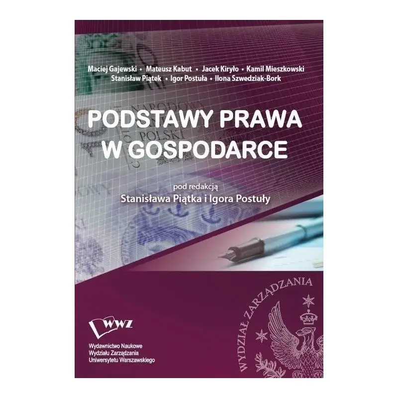 Podręcznik jest przeznaczony dla studentów uczestniczących w zajęciach z pierwszego przedmiotu z zakresu prawa na studiach zarządzania oraz studiach finansów, rachunkowości i ubezpieczeń, czyli „Podstaw prawa w gospodarce”, prowadzonego na Wydziale Zarządzania Uniwersytetu Warszawskiego. Zakres i konstrukcja podręcznika sprawiają, że może być on pomocnym źródłem nauki podstaw prawa również na studiach zarządzania, administracji, ekonomii i pokrewnych kierunków w innych szkołach wyższych. Podręcznik ma na celu wprowadzenie do bloku przedmiotów z zakresu prawa, które odwołują się do podstawowych pojęć i informacji dotyczących norm, przepisów i sposobu oddziaływania prawa w stosunkach społecznych i gospodarczych. Wprowadzającym zagadnieniom teoretycznym są poświęcone początkowe rozdziały. Kolejna część podręcznika jest poświęcona ustrojowi państwa, który tworzy ramy dla prowadzenia działalności gospodarczej. Na tej podstawie, w rozdziałach 5–14 przedstawiono główne instytucje publicznego prawa gospodarczego w Polsce. Dotyczą one konstytucyjnych podstaw gospodarki, podejmowania i prowadzenia działalności gospodarczej, korzystania z zasobów służących do wytwarzania produktów i usług, ochrony konkurencji oraz odpowiedzialności w działalności gospodarczej. […] Przygotowanie skryptu należy ocenić pozytywnie, jako istotną pomoc w procesie dydaktycznym. Publikacja skryptu przez Wydawnictwo Naukowe WZ jest w pełni uzasadniona potrzebami dydaktycznym. […] Bezpośredni styk problematyki objętej skryptem z wykładami z zakresu prawa administracyjnego oraz prywatnego prawa gospodarczego został ukształtowany w sposób, który eliminuje powtórzenia, a jednocześnie zapewnia ciągłość budowania wiedzy o prawie i utrwalenie kluczowych pojęć i konstrukcji. (Z recenzji prof. dr hab. Adama Jaroszyńskiego) […] Wraz z procesem rozwoju liberalizacji i rynkowych stosunków gospodarczych, kiedy wzrasta osobista odpowiedzialność kierowników, dyrektorów i menedżerów różnego szczebla, wiedza prawnicza staje się im wręcz niezbędna. Dlatego, że choćby tylko prawo gospodarcze to dziedzina ogromnie obszerna i skomplikowana, dla menedżerów potrzebna jest jej najbardziej skondensowana część. W dydaktyce tego przedmiotu wykładanego na kierunkach menedżerskich nawet takie ujęcie musi uwzględniać fakt ograniczonej ilości godzin przeznaczanych na tę dziedzinę wiedzy. Do jej opanowania okazuje się niezbędnym wprowadzenie do podstaw prawa. I tego zadania podjął się zespół autorski recenzowanej pozycji. Przedstawiony mi do oceny skrypt spełnia dobrze tę rolę. […] (Z recenzji prof. dr hab. Wiesława Czyżowicza) Fundamentals of law in the economy The textbook is intended for students taking classes of the first law subject in management and also finance, accounting and insurance studies, i.e. "Fundamentals of Law in the Economy", taught at the Faculty of Management of the University of Warsaw. The scope and structure also make the textbook a valuable source for learning the basics of law during management, administration, economics and related studies at other universities. The book is designed to be an introduction to a block of legal subjects that refer to basic concepts and information on norms, regulations and how the law interacts in social and economic relations. Initial chapters are devoted to the introductory theoretical issues. The next part of the textbook focuses on the state system, which forms the framework for conducting business. On this basis, Chapters 5–14 present the primary institutions of public economic law in Poland. They deal with the constitutional foundations of the economy, the undertaking and conduct of the economic activity, the usage of resources in the production of products and services, and the protection of competition and liability in economic activity.