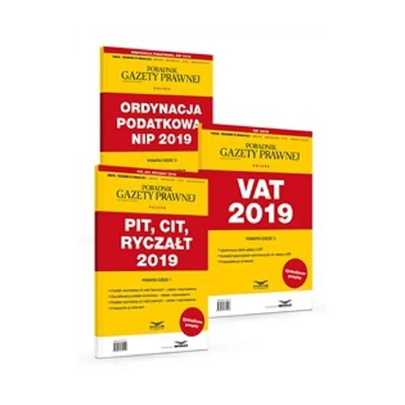 W skład kompletu wchodzą publikacje:PIT, CIT, Ryczałt 2019 SUPLEMENT aktualizujący zmiany w prawie po 1 stycznia 2019 r. orazPIT, CIT, ryczałt 2019. Podatki część 1Publikacja ta zawiera:ujednolicone teksty ustaw: o podatku dochodowym od osób fizycznych, o podatku dochodowym od osób prawnych oraz o zryczałtowanym podatku dochodowym, wybrane rozporządzenia wykonawcze, komentarz do zmian w ustawie o podatku dochodowym od osób fizycznych, w ustawie o podatku dochodowym od osób prawnych oraz w ustawie o zryczałtowanym podatku dochodowym – w formie przewodnika po zmianach. VAT 2019. Podatki część 2 rzygotowana publikacja zawiera:ujednolicony tekst ustawy o VAT, komplet rozporządzeń wykonawczych do ustawy o VAT, komentarz do zmian w ustawie o VAT wprowadzonych 1 stycznia 2019 r. w formie przewodnika po zmianach. Ordynacja podatkowa, NIP 2019. Podatki część 3 Publikacja zawiera komplet podstawowych przepisów podatkowych:Ordynację podatkową, ustawę o ewidencji i identyfikacji podatników i płatników (NIP), wybrane przepisy wykonawcze (rozporządzenia w sprawach podatkowych) obowiązujące w 2019 r., wydane na podstawie przepisów ustaw podatkowych.