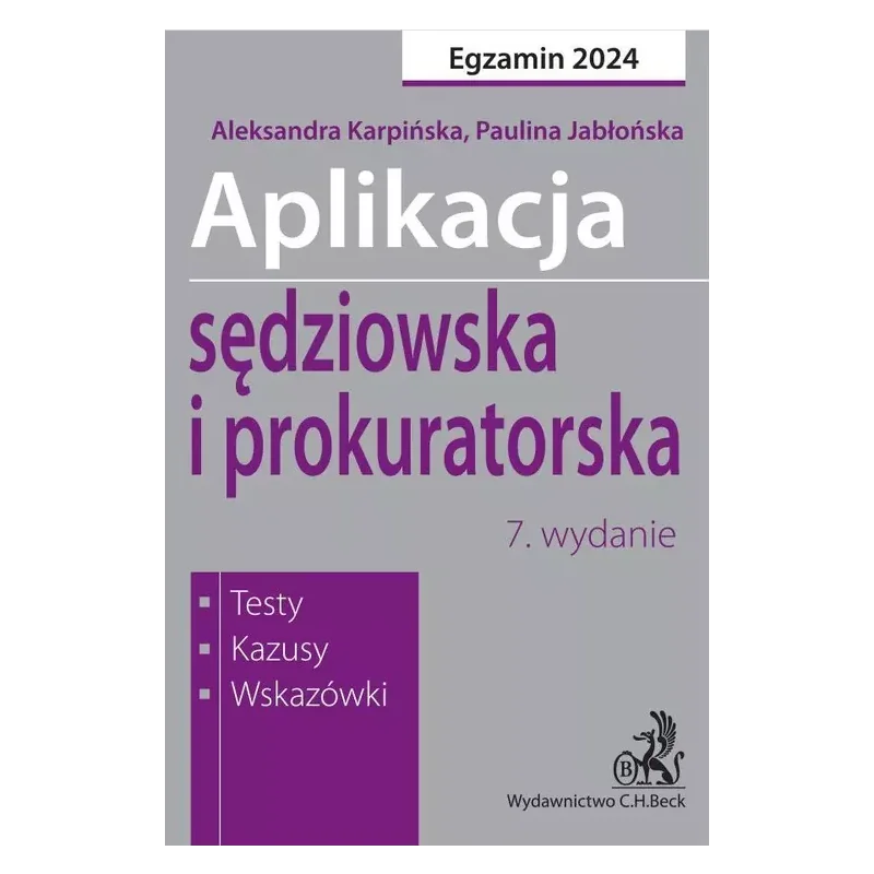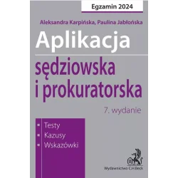 Publikacja dedykowana kandydatom na aplikację sędziowską i prokuratorską w 2024 roku. W nauce do konkursu na aplikacje sędziowską i prokuratorską niezbędne jest nie tylko zapamiętanie ogromnej ilości informacji zawartych w licznych aktach prawnych, ale przede wszystkim zrozumienie ich istoty. Nie jest celem Autorek wyczerpanie materii, z jaką kandydaci mogą spotkać się na konkursie ? taka pozycja nie byłaby w ogóle technicznie możliwa. Główny nacisk w publikacji jest położony na wskazanie tego, czym zdaniem Autorek warto kierować się w nauce do obu etapów konkursu, zwrócenie uwagi na najistotniejsze kwestie i zaproponowanie pewnej metodyki pracy, przydatnej również w trakcie samego rozwiązywania testów i sporządzania pracy pisemnej. Wychodząc z tego założenia w opracowaniu znajdą Państwo również zadania konkursowe z dotychczasowych naborów ? stanowią one bowiem punkt wyjścia, którym należy kierować się w przygotowaniach do konkursu. Ich szczegółowa analiza, której podjęły się Autorki, pozwoli zrozumieć zadania stawiane przez komisję i sprostać im w dniu konkursu. Książka składa się z 4 części: Część I zawiera wskazówki do nauki, komentarze, wyjaśnienia i rozwiązania najtrudniejszych pytań testowych z egzaminów wstępnych oraz omówienie najważniejszych zmian w prawie. Część II to testy z rozwiązaniami z lat poprzednich oraz testy autorskie, przygotowane w układzie jaki pojawia się na egzaminie wstępnym. Część III zawiera najtrudniejsze kazusy, które pojawiły się na egzaminie wstępnym z omówieniami i komentarzami, a co najważniejsze zawiera liczne praktyczne wskazówki jak rozwiązywać kazusy, na co zwracać uwagę, jak rozpisywać poszczególne zagadnienia i jak się prawidłowo przygotować do pracy nad kazusami. Część IV to wybrane testy z zagadnień będących przedmiotem egzaminu wstępnego na aplikację sędziowską i prokuratorską. Testy te pochodzą z książek autorstwa M. Stepaniuka Aplikacja adwokacka, Aplikacja notarialna oraz Aplikacja komornicza.