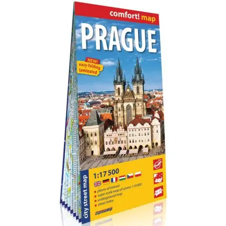 Zaskakujące instalacje Davida Černego, zabytkowy Ratusz Staromiejski ze słynnym zegarem Orloy, romantyczna dzielnica Malá Strana i fantazyjny Tańczący Dom. A do tego pyszne knedliczki i morze piwa! Dwustronnie laminowany, wygodny w składaniu plan Pragi będzie niezastąpioną pomocą w odkrywaniu uroków czeskiej stolicy. Na mapie m.in.: - bogata treść turystyczna, w tym: zabytki, muzea, hotele i inne istotne obiekty, - linie i stacje metra, - linie i przystanki tramwajowe, - szczegółowy plan centrum w skali 1:10 000 (1 cm – 100 m), - schemat metra, - skorowidz ulic. Seria comfort! map to praktyczne mapy na każdą okazję. Dwustronnie laminowane i wodoodporne, nie tracą walorów użytkowych przez długi czas, można na nie nanosić i ścierać notatki. Mapy łatwo też złożyć w dowolny sposób, nie niszcząc ich. Seria obejmuje zarówno mapy turystyczne, jak i samochodowe oraz plany miast w różnych formatach.
