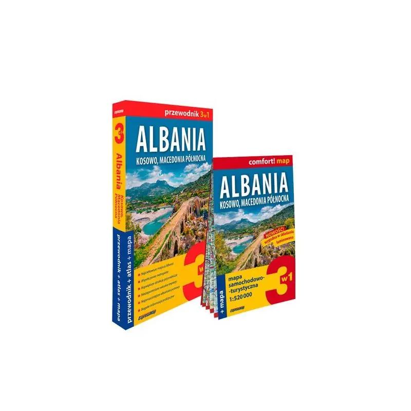 Największe atrakcje Albanii, Kosowa i Macedonii Północnej w jednym tomie. Osmańskie twierdze, zdobione freskami cerkwie, zabytkowe meczety, wszechobecne schrony. Urokliwe zaułki Gjirokastry, Beratu, Prizrenu i Ochrydy. Echa starożytności w Butrincie, Apollonii i Durrës. Śródziemnomorskie słońce i plaże Adriatyku, tętniące życiem kurorty na Riwierze Albańskiej. Pyszne ryby i owoce morza, doskonała jagnięcina pod każdą postacią i oczywiście kawa, której aromat spowija uliczki bałkańskich miejscowości. Te i inne atrakcje Albanii, Kosowa i Macedonii Północnej pomoże odkryć przewodnik Express Map z serii 3w1.