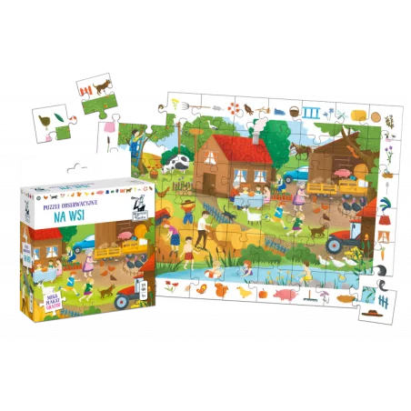 Puzzle obserwacyjne. Na wsi to wspaniała propozycja dla dzieci od czwartego roku życia. Kolorowa ilustracja, przedstawiająca scenkę z życia na wsi, zachęci maluszki do układania i do opowiadania niesamowitych historii. Puzzle składają się z 54 solidnie wykonanych elementów, a do zestawu dołączony jest także plakat, który może być znakomitą