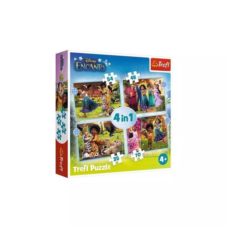 Odkryj świat magii i kolorów z zestawem Puzzle 4w1 Nasze Magiczne Encanto od marki Trefl, przeznaczonym dla dzieci od 4. roku życia. Układanki przedstawiają bohaterów popularnej animacji Disney'a w czterech wyjątkowych scenkach. Różne poziomy trudności (35, 48, 54 i 70 elementów) sprawiają,