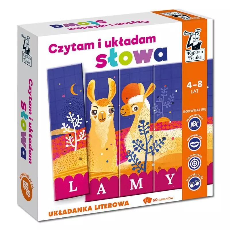 Układanka „Czytam i układam słowa” polega na układaniu prostych wyrazów: nazw znanych dziecku zwierząt. W skład pakietu wchodzi 60 dwustronnych kafelków, z których można ułożyć 8 trzyliterowych i 9 czteroliterowych nazw. Na odwrocie znajdują się pojedyncze litery, z których można układać własne słowa.