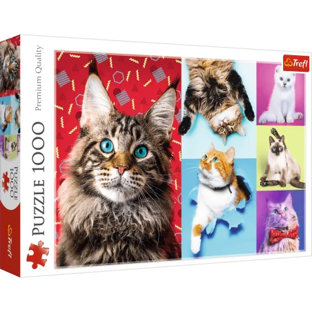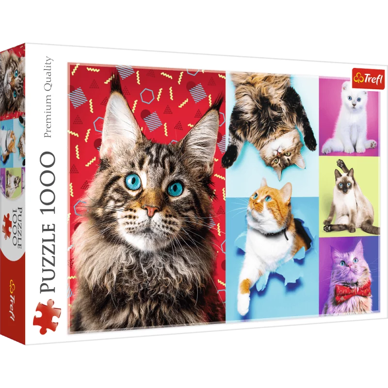 Puzzle Wesołe koty składające się z 1000 elementów przedstawiające kolaż zdjęć uroczych kotów, różnych ras. Po ułożeniu powstanie obrazek