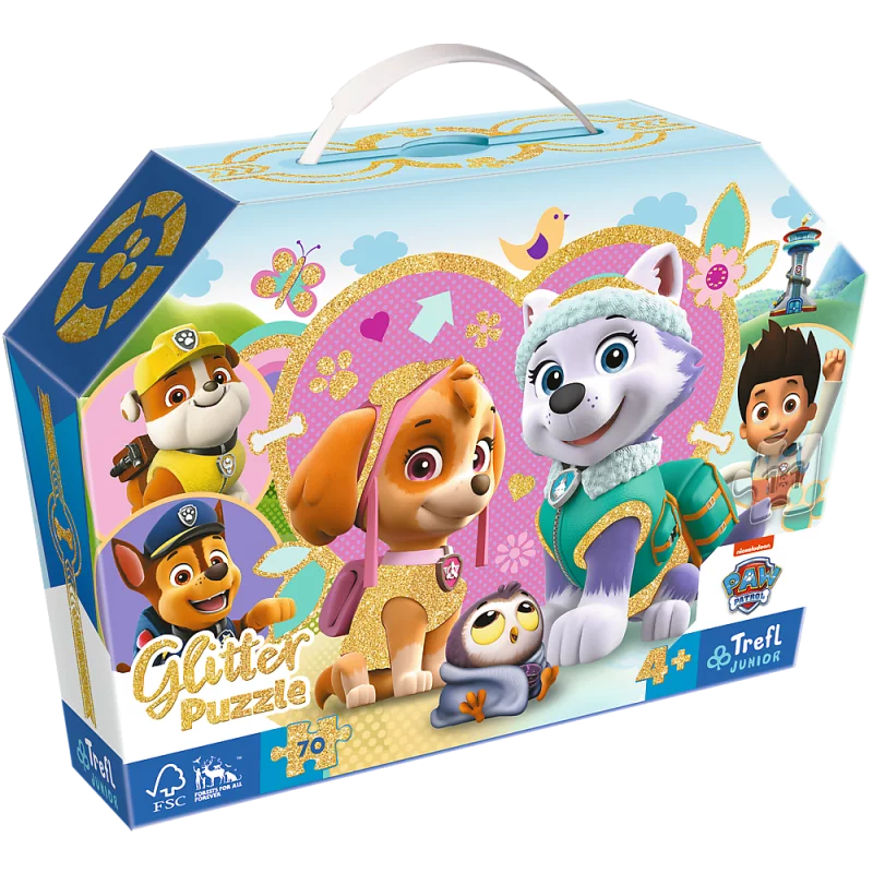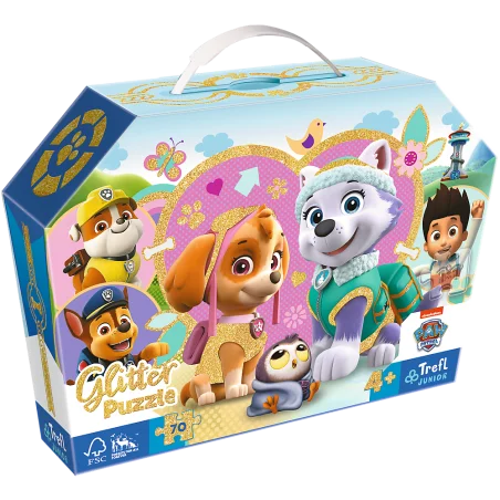 Puzzle glitter Urocza Skye i Everest marki Trefl JUNIOR to układanki ozdobione delikatnym złotym brokatem, który sprawia, że zarówno opakowanie, jak i poszczególne elementy pięknie się mienią i sprawiają niesamowite wrażenie.