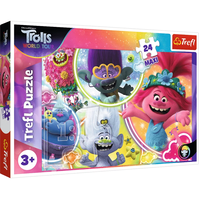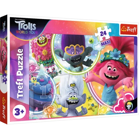 Muzyczny świat Troli to puzzle 24 maxi składające się z bardzo dużych elementów, zaprojektowaną z myślą o wszystkich fanach i fankach filmu Troli (Trolls World Tour).