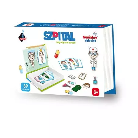 W zestawie 39 elementów - magnetyczne elementy strojów lekarzy i pacjentów, wyposażenie lekarza, apteczka, lekarstwa, 8 obrazków.