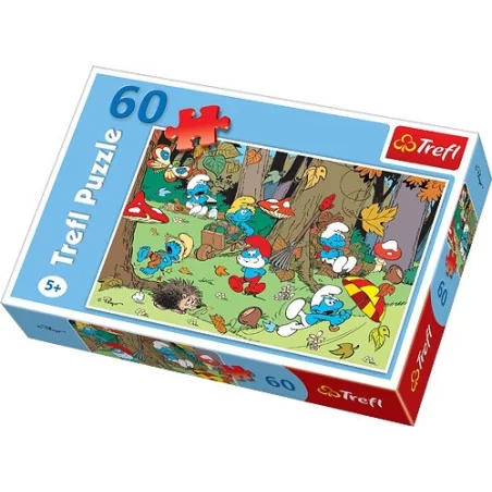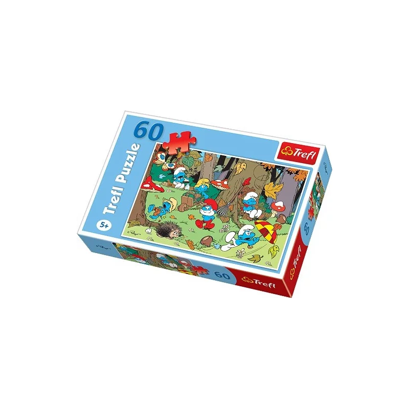 Kolorowe puzzle ze Smerfami od Trefl. Po ułożeniu 60 elementów powstaje obrazek z niebieskimi stworkami sprzątającymi las.