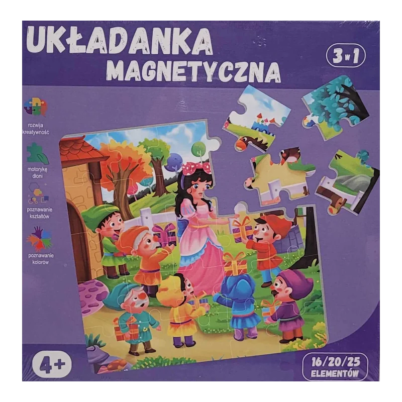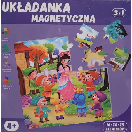 PUZZLE UKŁADANKA MAGNETYCZNA 3 w 1 to zestaw 16/20/25 elementów wykonanych z trwałego i bezpiecznego kartonu. Dzięki magnetycznym elementom, dziecko może łatwo połączyć elementy i ułożyć trzy różne obrazki. Produkt przeznaczony jest dla dzieci