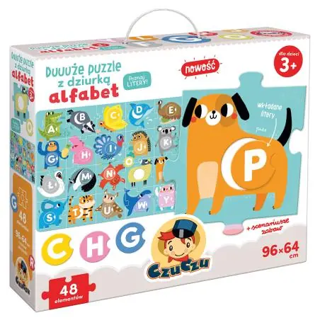 Składa się z 48 elementów: 24 tradycyjnych puzzli i 24 wyjmowanych kółeczek z literami, które należy dopasować do odpowiednich dziurek.