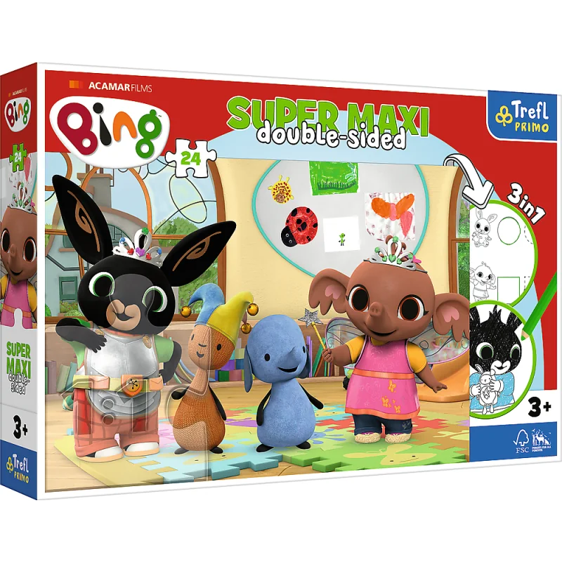 Na rewersue każdej układanki znajdują się dwie zabawy – kolorowanka oraz gra z elementami kolorowania - wyzwanie dla prawdziwych bystrzaków!Puzzle Super Maxi 24 to świetna zabawa i radość z samodzielnego tworzenia. Dostępne są wzory z ulubionymi bohaterami animowanych filmów i seriali dla dzieci.