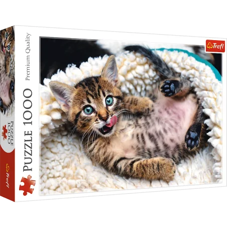 Puzzle 1000 elementów przedstawiające wesołego kotka. Po ułożeniu powstanie obrazek