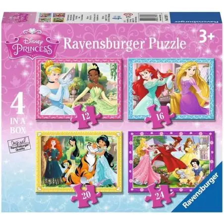 Zawartość pudełka: 4 układanki 12, 16, 20 i 24 elementowe z motywem Księżniczki Disneya.