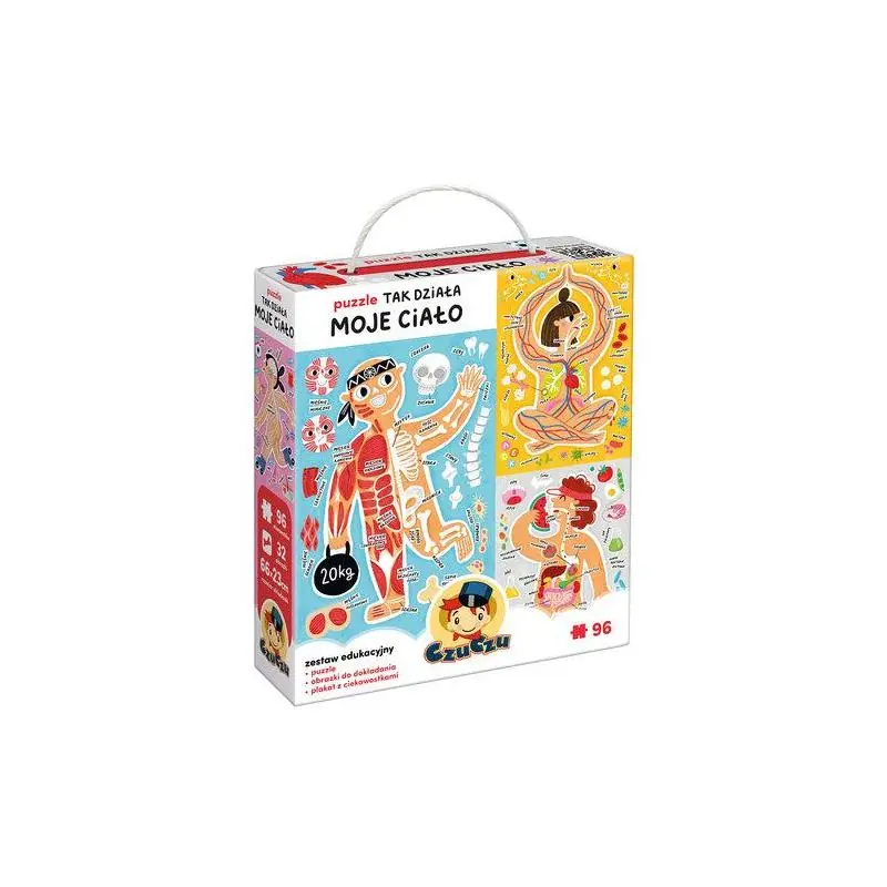 Edukacyjny zestaw to fantastyczny pomysł na prezent dla bystrego i żądnego wiedzy starszaka i sposób na pierwszą lekcję anatomii. Duża układanka składa się aż z 96 elementów i w przyjazny sposób przedstawia schematyczną budowę przeróżnych układów ludzkiego ciała. Na dodatkowych 32 elementach znajdują się wizerunki różnych narządów.