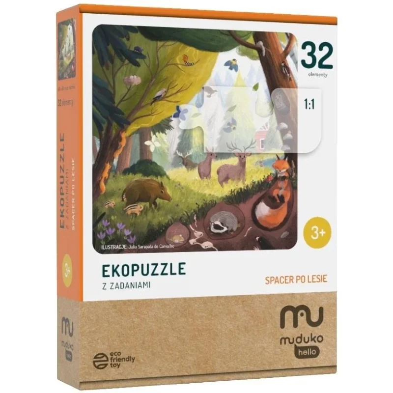 Ekopuzzle Spacer po lesie zabiorą Was do pięknej krainy wypełnionej różnymi zwierzętami. Jednak samo ułożenie obrazka to dopiero początek zabawy. W zestawie znajduje się też bajka z nawiązującymi do ilustracji zadaniami rozwijającymi spostrzegawczość, słownictwo i liczenie.