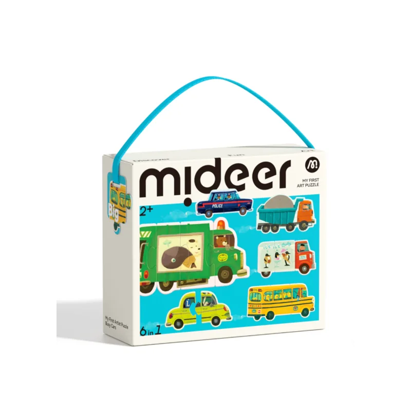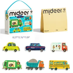 Liczba elementów: Samochód (2 elementy), Samochód policyjny (2 elementy), Samochód z lodami (3 elementy), Śmieciarka (4 elementy), Samochód dostawczy (5 elementów), Autobus szkolny (6 elementów)