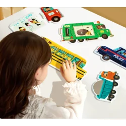 Nauka rozpoznawania kształtów i rozwijania wyobraźni przestrzennej u najmłodszych jest bardzo ważna. Dzięki zestawowi Moje pierwsze puzzle maluszek ma okazję rozpocząć swoją przygodę z układankami, poznając przy okazji środki transportu. Pomagając mu w zabawie, możemy wspierać rozwój jego koncentracji. Puzzle zostały wycięte tak, aby ich