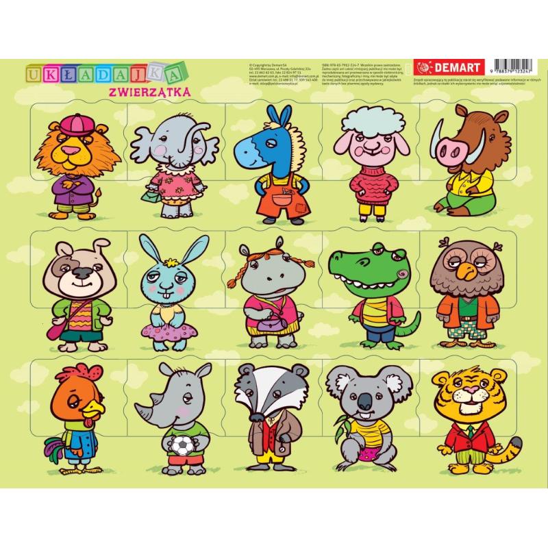 UKŁADAJKA, czyli puzzle ze zwierzątkami dla najmłodszych ze wzorem (3–5 lat)! Z 15 ruchomymi elementami o indywidualnym niepowtarzalnym kształcie wykrojonymi w odpowiednich miejscach obrazka. W Układajce dziecko ma odnaleźć i dopasować 15 wyjmowanych elementów z górnymi częściami sylwetek zabawnie narysowanych zwierzątek, takich jak np.