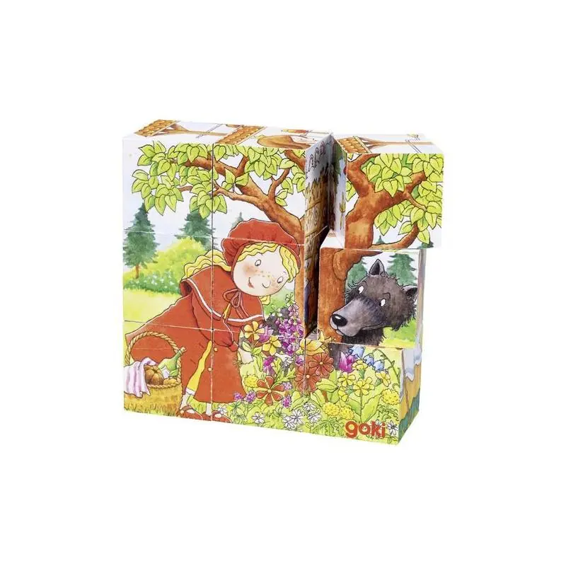 Puzzle układanka sześcienna Czerwony Kapturek Goki to klasyczna, edukacyjna zabawka drewniana, która w atrakcyjny sposób rozwija wyobraźnię, spostrzegawczość i zdolności manualne dziecka. Układanka przedstawia sześć barwnych scen z popularnej bajki o Czerwonym Kapturku, które można tworzyć, obracając kolorowe klocki.