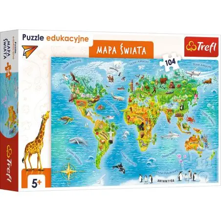 Puzzle edukacyjne „Mapa świata” Trefl to doskonała propozycja dla dzieci ciekawych świata, które chcą uczyć się geografii w angażujący i przyjemny sposób. Zestaw składa się ze 104 trwałych elementów, które po ułożeniu tworzą barwną, pełną szczegółów mapę świata z