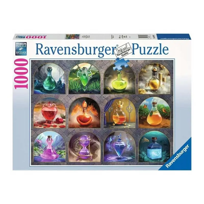 Ravensburger Puzzle 1000 el Potężna Mikstura to doskonała rozrywka dla całej rodziny. Puzzle wspierają rozwój koncentracji, cierpliwości i spostrzegawczości. Idealne jako aktywność relaksacyjna w domu, podczas spotkań towarzyskich lub jako prezent dla miłośników układanek.