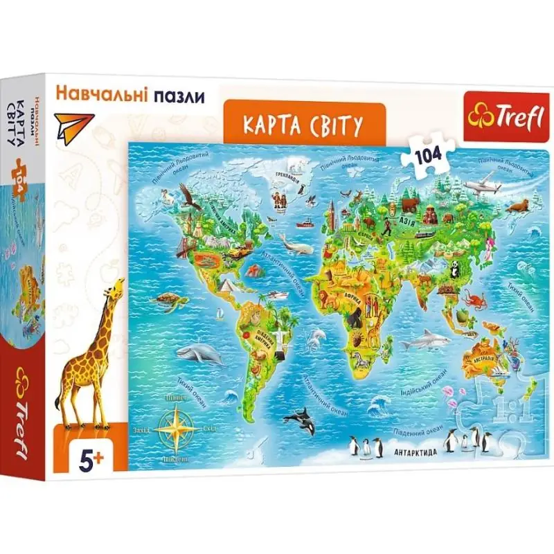 Puzzle edukacyjne „Mapa świata” 104 elementy od Trefl to doskonała propozycja dla dzieci od 5. roku życia, które z ciekawością odkrywają świat. Ilustrowana mapa w przyjaznej formie przedstawia kontynenty, kraje, zwierzęta i charakterystyczne obiekty, łącząc zabawę z nauką