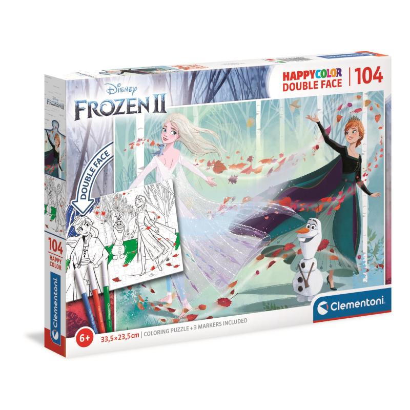 Clementoni Disney Frozen II Happy Color to wyjątkowa układanka, która łączy zabawę z kreatywnością. Puzzle składają się ze 104 elementów, a po ich ułożeniu dziecko może pokolorować obraz z drugiej strony, tworząc własną wersję bajkowej Krainy Lodu. To