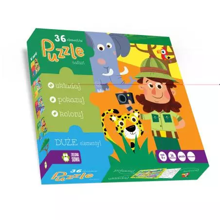 Gdzie schował się nosorożec? Co robi hipopotam? Czym zajada się żyrafa? Kto skacze po drzewie - czy to małpka? Ułóż puzzle i poznaj wszystkich egzotycznych mieszkańców safari! Spotkasz tam m.in.: słonia, zebry, tygrysa, papugę i surykatki! Seria puzzli wielkoelementowych z wyjątkowymi, kolorowymi ilustracjami. Dzięki dużym elementom i wygodnemu formatowi są idealne dla małych dzieci. Liczba puzzli i szczegółowość ilustracji są dostosowane do wieku dziecka: 2-latki układają obrazek składający się z 20 puzzli, a 4-latki z 36 elementów. Dodatkowo, puzzle zwierają ćwiczenie na spostrzegawczość - sprawdź, czy znajdziesz wszystkie wskazane elementy w specjalnej ramce? Po ułożeniu puzzli pokoloruj kolorowankę znajdującą się na odwrocie układanki. Udanej zabawy!