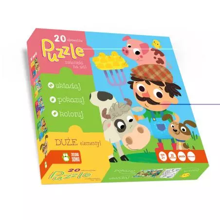 Gdzie mieszkają kury? Czy świnki kąpią się w błocie? Gdzie skrywają się myszki? I kto straszy w polu? Ułóż puzzle i odkryj sekrety życia na wsi! Spotkacie tam m.in. owce, osła, kozła, kaczki, kury i wiele innych ciekawy zwierząt. Seria puzzli wielkoelementowych z wyjątkowymi, kolorowymi ilustracjami. Dzięki dużym elementom i wygodnemu formatowi są idealne dla małych dzieci. Liczba puzzli i szczegółowość ilustracji są dostosowane do wieku dziecka: 2-latki układają obrazek składający się z 20 puzzli, a 4-latki z 36 elementów. Dodatkowo, puzzle zwierają ćwiczenie na spostrzegawczość - sprawdź, czy znajdziesz wszystkie wskazane elementy w specjalnej ramce? Po ułożeniu puzzli pokoloruj kolorowankę znajdującą się na odwrocie układanki. Udanej zabawy!