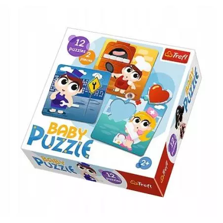 Puzzle dla najmłodszych - w jednym opakowaniu znajduje się aż 12 obrazków, każdy z nich składa się z dwóch elementów, po ułożeniu obrazki przedstawiają różne zawody