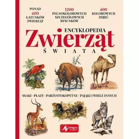 Opis ponad 400 gatunków zwierząt z całego świata reprezentujących wszystkie kontynenty i strefy klimatyczne – od owadów do ślimaków, od ssaków do pająków, od żab do ryb tropikalnych. Szczegółowe informacje o budowie, środowisku, zachowaniu, odżywianiu każdego zwierzęcia uzupełnione ramkami zawierającymi bogaty zestaw podstawowych danych oraz mapkami występowania gatunków. Aż 1200 pełnokolorowych szczegółowych rysunków oraz ponad 400 kolorowych zdjęć zwierząt w ich naturalnych środowiskach.
