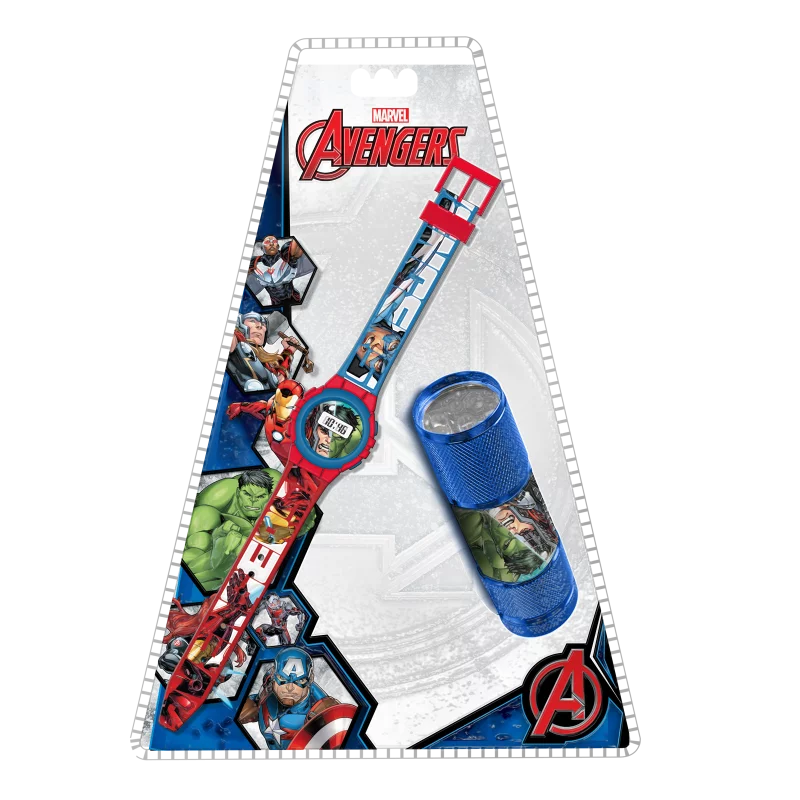 Zestaw Avengers z cyfrowym zegarkiem i latarką to wyjątkowo atrakcyjny zestaw prezentowy dla Twojego dziecka.