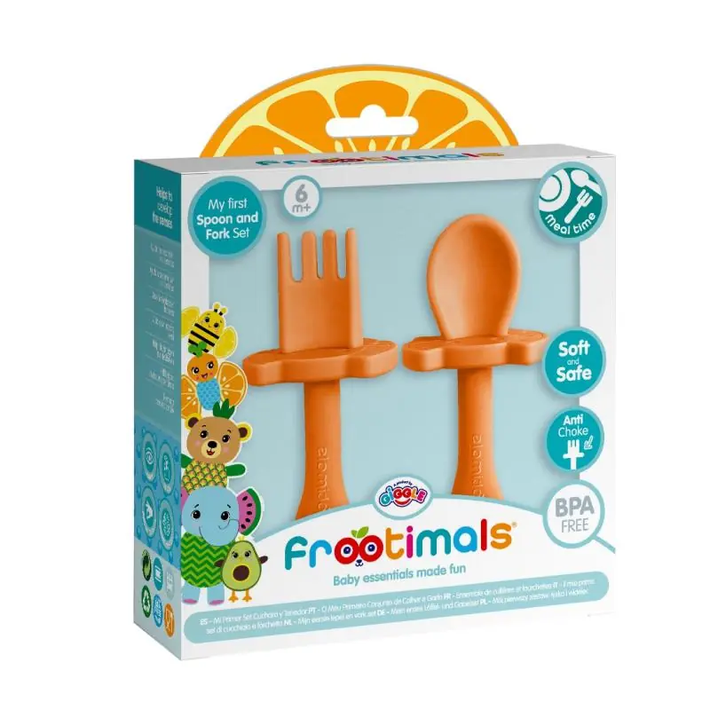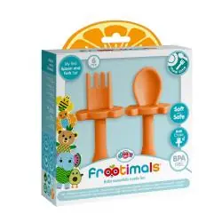 Zestaw łyżeczka i widelec Frootimals Orangiefly Kids Euroswan 6m+ to praktyczne sztućce dla niemowląt do nauki jedzenia, wykonane z bezpiecznych materiałów BPA FREE. Idealny wybór na początek rozszerzania diety i nauki samodzielności.