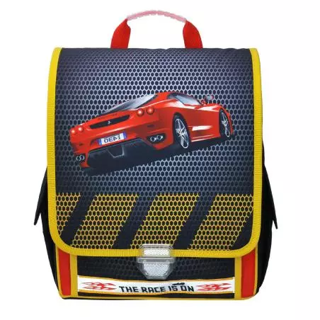 Tornister szkolny z atrakcyjnym motywem samochodowym, co sprawia, że jest on przeznaczony głównie dla chłopców. W pojemnej komorze głównej pomieszczą się wszystkie konieczne artykuły szkolne. Dodatkowe jedna kieszeń przednia i dwie kieszenie boczne na drobiazgi. Tornister zapinany jest na wygodny klips w odblaskiem. Usztywnione plecy z systemem