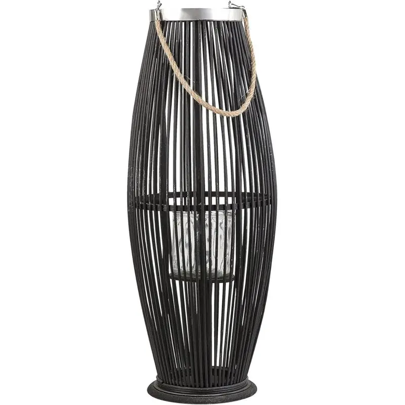 Lampion TAHITI Beliani bambusowy 72 cm czarny to pleciona latarnia dekoracyjna ze szklanym świecznikiem, która buduje ciepły klimat w salonie, na tarasie lub w ogrodzie. Naturalny bambus w czarnym wykończeniu świetnie wpisuje się w style boho, japandi, skandynawski i loft, a stabilna, okrągła podstawa oraz uchwyt do przenoszenia ułatwiają
