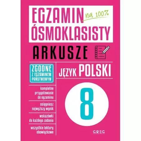 Ósmoklasista znajdzie tutaj wszystkie typy zadań, zarówno zamkniętych, jak i otwartych, oraz wskazówki i sugestie do każdego zadania. Zgodnie z obowiązującym programem nauczania arkusze oparte są na lekturach dla klas VII-VIII.