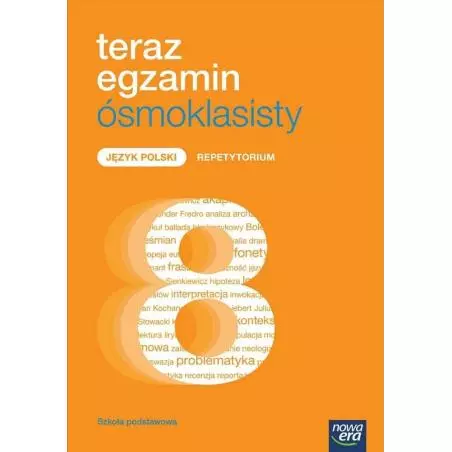 Nowe wydanie repetytorium "Teraz egzamin ósmoklasisty. Język polski" do szkoły podstawowej jest opracowane ściśle pod kątem egzaminu i realizuje praktyczne podejście do nauki: porcje wiedzy do powtórki mają zastosowanie w propozycjach zadań typu egzaminacyjnego. Materiały można wykorzystać do pracy na lekcji, w domu i na zajęciach
