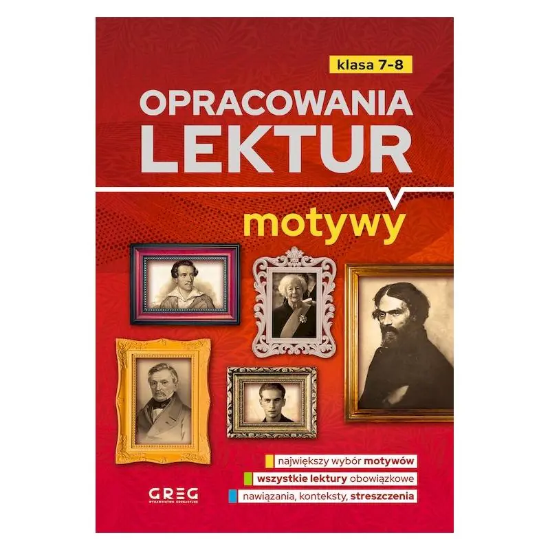 Wydawnictwo GREG od lat słynie z najlepszych na rynku materiałów edukacyjnych. Tak jak pozostałe książki, również Opracowania lektur i wierszy - motywy dla klas 7-8, są kompletną pomocą szkolną dla wszystkich uczniów chcących szybko i bez stresu opanować wymagany od nich materiał. Dla starszych uczniów polecamy kolejną książkę z serii: Opracowania lektur - motywy - liceum/technikum.