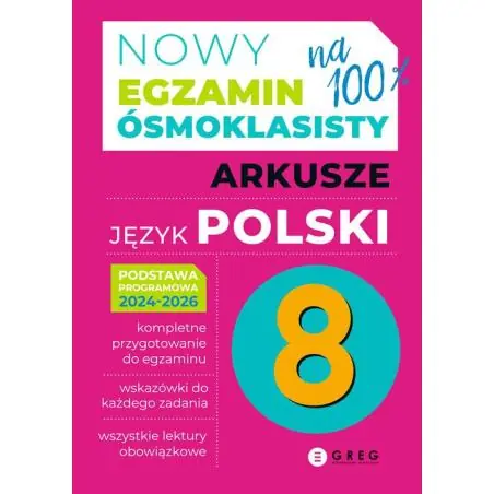 Zdaj egzamin ósmoklasisty bez stresu z najnowszymi arkuszami od Wydawnictwa GREG! Aktualne wydanie jest w pełni zgodne z obowiązującymi obecnie wymaganiami egzaminacyjnymi, więc masz gwarancję, że nauczysz się dokładnie tego, co jest wymagane! Trening przed egzaminem Zestaw sześciu arkuszy, oparty na wymaganiach egzaminacyjnych oraz oryginalnych materiałach CKE, pozwoli Ci doskonale zrozumieć strukturę egzaminu i przećwiczyć każdy typ zadania. Przygotuj się praktycznie do egzaminu, rozwiązując zadania identyczne z tymi, które pojawiają się na egzaminie kończącym szkołę podstawową. Zadania, odpowiedzi, wskazówki W książce znajdziesz klucz z odpowiedziami oraz dostęp online do wskazówek do każdego zadania. Aktualne wydanie książki zawiera wszystko, czego potrzebujesz do skutecznego przygotowania się do egzaminu z języka polskiego - od szczegółowego opisu przebiegu egzaminu, przez próbne arkusze, aż po strategie rozwiązywania zadań. Przygotowane przez najlepszych nauczycieli Ta bestsellerowa seria arkuszy dla ósmoklasistów jest polecana zarówno przez zadowolonych uczniów, jak i nauczycieli. Opracowana przez doświadczonych polonistów z Wydawnictwa GREG, to nieoceniona pomoc w przygotowaniach do tego ważnego egzaminu. Wybieraj najnowsze wydanie! Gwarancja sukcesu na egzaminie Tylko rozwiązywanie arkuszy gwarantuje powodzenie na egzaminie - ćwiczysz określone typy zadań, których możesz spodziewać się podczas egzaminu. Zacznij ćwiczyć już teraz i osiągnij najwyższy wynik - z nowymi arkuszami od Wydawnictwa GREG!