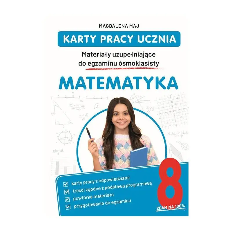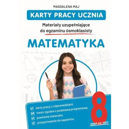 Karty pracy ucznia. Materiały uzupełniające do egzaminu ósmoklasisty. Matematyka to publikacja przeznaczona do samodzielnej pracy dla uczniów, którzy pragną pogłębić swoją wiedzę matematyczną oraz przygotować się do egzaminu ósmoklasisty. Karty pracy podzielone są tematycznie, umożliwiając uczniom systematyczną pracę nad konkretnymi