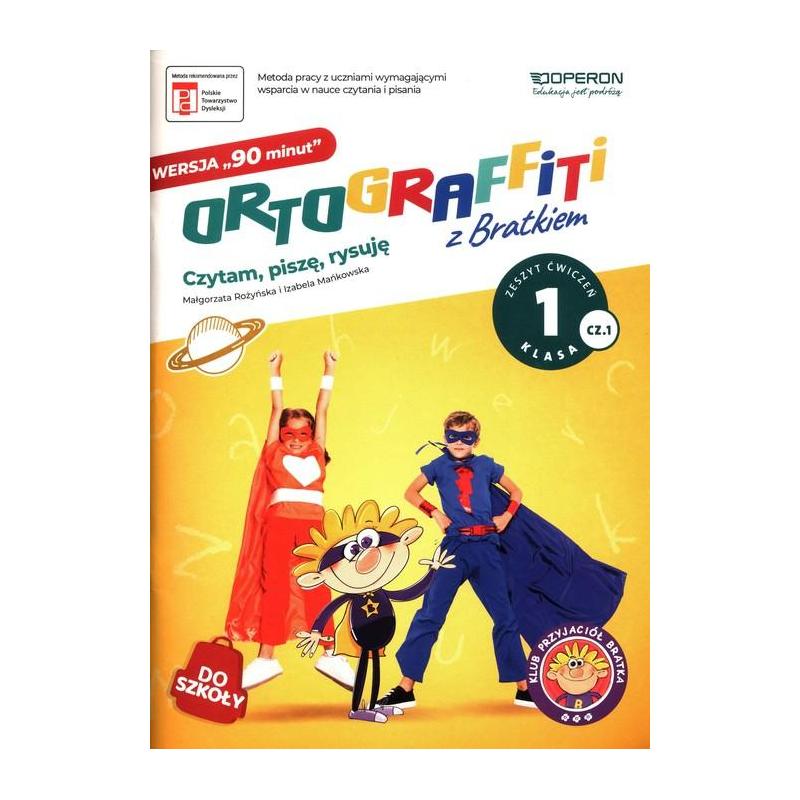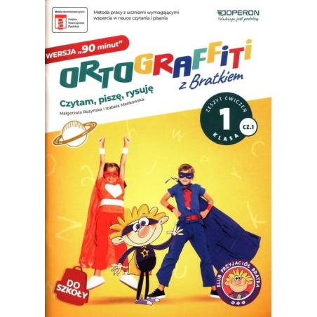 Seria Ortograffiti z Bratkiem występuje w dwóch wersjach: wersji „90 minut” i wersji „45 minut”. Wersja “90 minut” (dotychczasowa) jest przeznaczona dla tych nauczycieli, którzy prowadzą 2 godziny zajęć korekcyjno-kompensacyjnych lub dydaktyczno-wyrównawczych w tygodniu w danej grupie, zaś wersja “45 minut” dla tych, którzy prowadzą 1 godzinę takich zajęć w tygodniu. Ortograffiti z Bratkiem. Wersja 90 minut. Klasa 1. Zestaw W zestawie: 2 zeszyty ćwiczeń na jeden rok szkolny: Ortograffiti z Bratkiem. Wersja 90 minut. Klasa 1. Część 1. oraz Ortograffiti z Bratkiem. Wersja 90 minut. Klasa 1. Część 2. Karty pracy - 32 karty pracy, w tym karty postępów i karty pracy domowej. W ramach podsumowania prowadzący wypełnia z uczniami kartę postępów na koniec każdego bloku. Karty pracy domowej pozwalają dzieciom utrwalić wiadomości z danych zajęć. Dodatkowo w zestawie są karty z pomocami dydaktycznymi do samodzielnego wykonania: zjadacz liter, okienko do czytania. A także: dyplom, gra memo do wycięcia, planszówka, inne. Teczka do przechowywania materiałów i kart pracy.