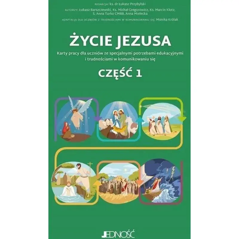 Publikacja „Życie Jezusa” jest propozycją pomocy dydaktycznej w formie kart pracy dla nauczycieli, opiekunów oraz rodziców dzieci z niepełnosprawnością intelektualną w stopniu umiarkowanym i znacznym. „Jest to kolejna, po „Roku liturgicznym z kartami pracy” i „Świętych i Błogosławionych z kartami pracy”, publikacja odpowiadająca na potrzeby osób pracujących z takimi uczniami. Karty pracy łączą przekaz treści religijnych, ćwiczenia pozwalające uczniom doskonalić umiejętności szkolne oraz unikatowy zbiór symboli PCS (Picture Communication Symbols) opisujący wydarzenia z życia Jezusa i Świętej Rodziny. Wykorzystanie tych unikatowych symboli pomaga uczniom lepiej zrozumieć treść lekcji oraz samodzielnie wypowiadać się na omawiany temat. Każda historia przedstawiona jest w formie łatwego do czytania tekstu, fragmentu Pisma Świętego (ze znakami komunikacji alternatywnej) oraz zadań i ćwiczeń utrwalających wydarzenia z życia Jezusa. Teczka zawiera ponadto propozycje zadań do wykonania, puzzle, kolorowanki, rebusy, wycinanki quizy itp. Mamy nadzieję, że praca z naszymi kartami pracy pozwoli uczniom poznać i utrwalić znajomość wydarzeń z życia Zbawiciela. Część 1 (tematy 1-12) zawiera następujące materiały: zwiastowanie, Boże Narodzenie, przybycie Trzech Króli, ofiarowanie Pana Jezusa w świątyni, chrzest Pana Jezusa, kuszenie Pana Jezusa na pustyni, powołanie dwunastu apostołów, cuda dokonane przez Pana Jezusa (przemienienie wody w wino w Kanie Galilejskiej, uciszenie burzy, cudowny połów ryb, chodzenie po wodzie) oraz Jezus naucza w przypowieściach.