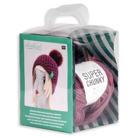 - zawiera: włóczkę w kolorze wrzosowym (waga: 100 g, długość: 80 m), pompon ok 7 cm szerokość, szydełko 10 mm, gruba igła, instrukcja