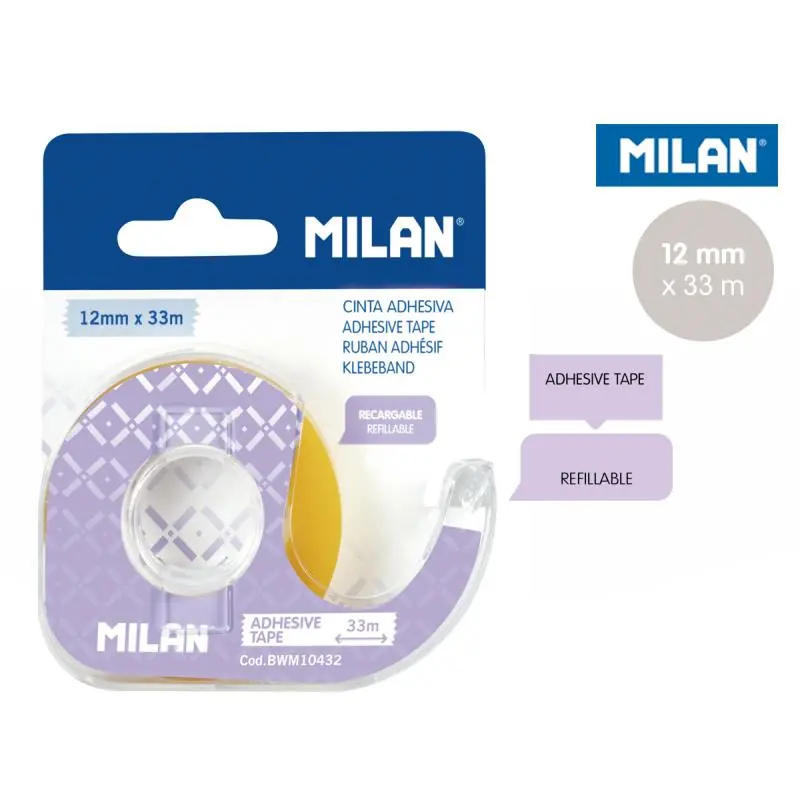 - Taśma samoprzylepna przezroczysta, lekko żółta na fioletowym dyspenserze do wielokrotnego użytku z metalowym ostrzem.
