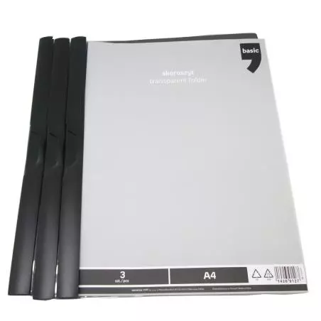 Zestaw trzech przezroczystych teczek, które są przeznaczone do przechowywania dokumentów w formacie A4.