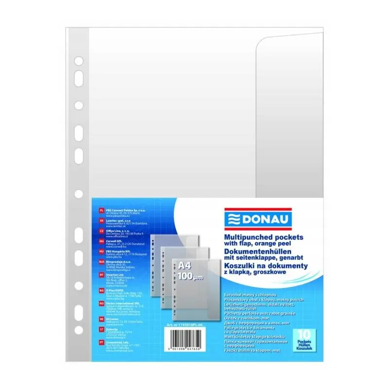 Koszulki z klapką Donau A4 100 mikronów 10 szt. to funkcjonalne i trwałe koszulki na dokumenty wykonane z matowej folii polipropylenowej. Przeznaczone do bezpiecznego przechowywania i archiwizacji dokumentów w formacie A4 w biurze, szkole i domu.