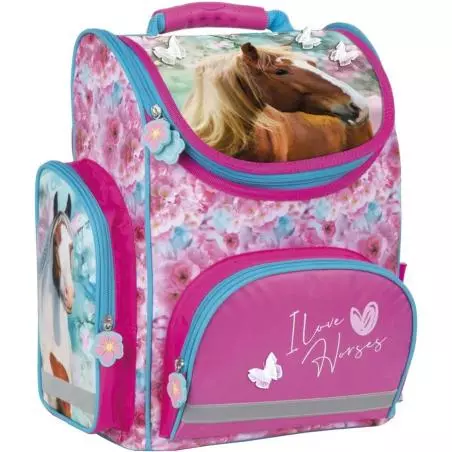 Funkcjonalny, lekki tornister szkolny. Pokrywa tornistra zamykana na zamek, wewnątrz etykieta na dane adresowe. Ergonomiczny tył, miękkie wyściełane szelki, trzy kieszenie zewnętrzne. Dno wykonane z wodoodpornego tworzywa zabezpieczającego przed zabrudzeniem, zamakaniem. Ze wszystkich 4 stron tornistra - taśmy odblaskowe. wymiary: 37 x 27 x 16 cm waga: 940 g