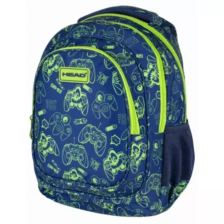 Gamingowy trzykomorowy plecak szkolny Head dla najmłodszych miłośników gier komputerowych. Granatowy Print z zielonymi joystickami i kontrolerami doceni każdy pasjonat cyfrowej rozrywki.